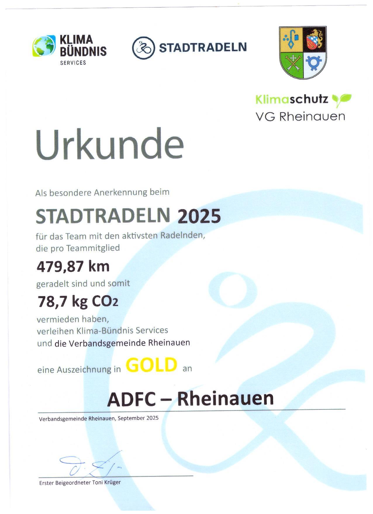 Das Team des ADFC Rheinauen wurde für seine hervorragende Leistung beim STADTRADELN 2025 in der Verbandsgemeinde Rheinauen ausgezeichnet.