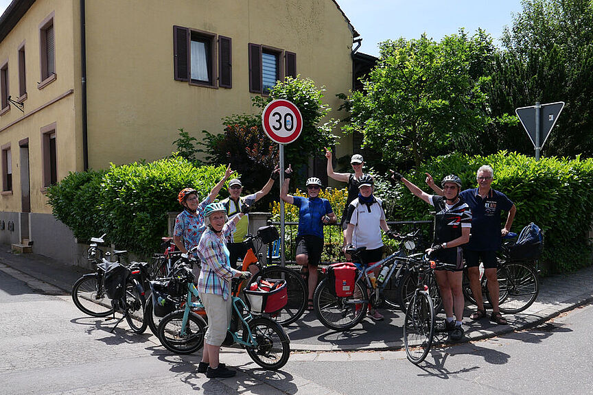 Dann werden wir in Fürfeld fündig, was kann es anders sein als ein Verkehrsschild, dass den Autoverkehr auf 30 reduziert, das gefällt uns Radfahren, es macht das Miteinander sicherer und wir platzieren uns als Gruppe. Wir danken dem ADFC Rheinland-Pfalz für 30 Jahre unermüdlicher Arbeit für das Radfahren und wünschen ihm noch viele weitere erfolgreiche Jahre in der Lobbyarbeit für den Alltagsradfahrer.
