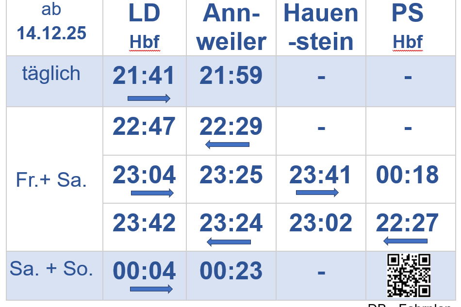 Die Bahn-App zeigt schon heute das gesamte Angebot. Täglich kann man jetzt 21:41 Uhr von Landau mit dem Zug nach Annweiler fahren, das ist eine Stunde später, als bisher. Die lange Strecke von Landau HBF bis Pirmasens HBF zwischen 23 Uhr und Mitternacht wird freitags und samstags bedient, das aber in beide Richtungen.